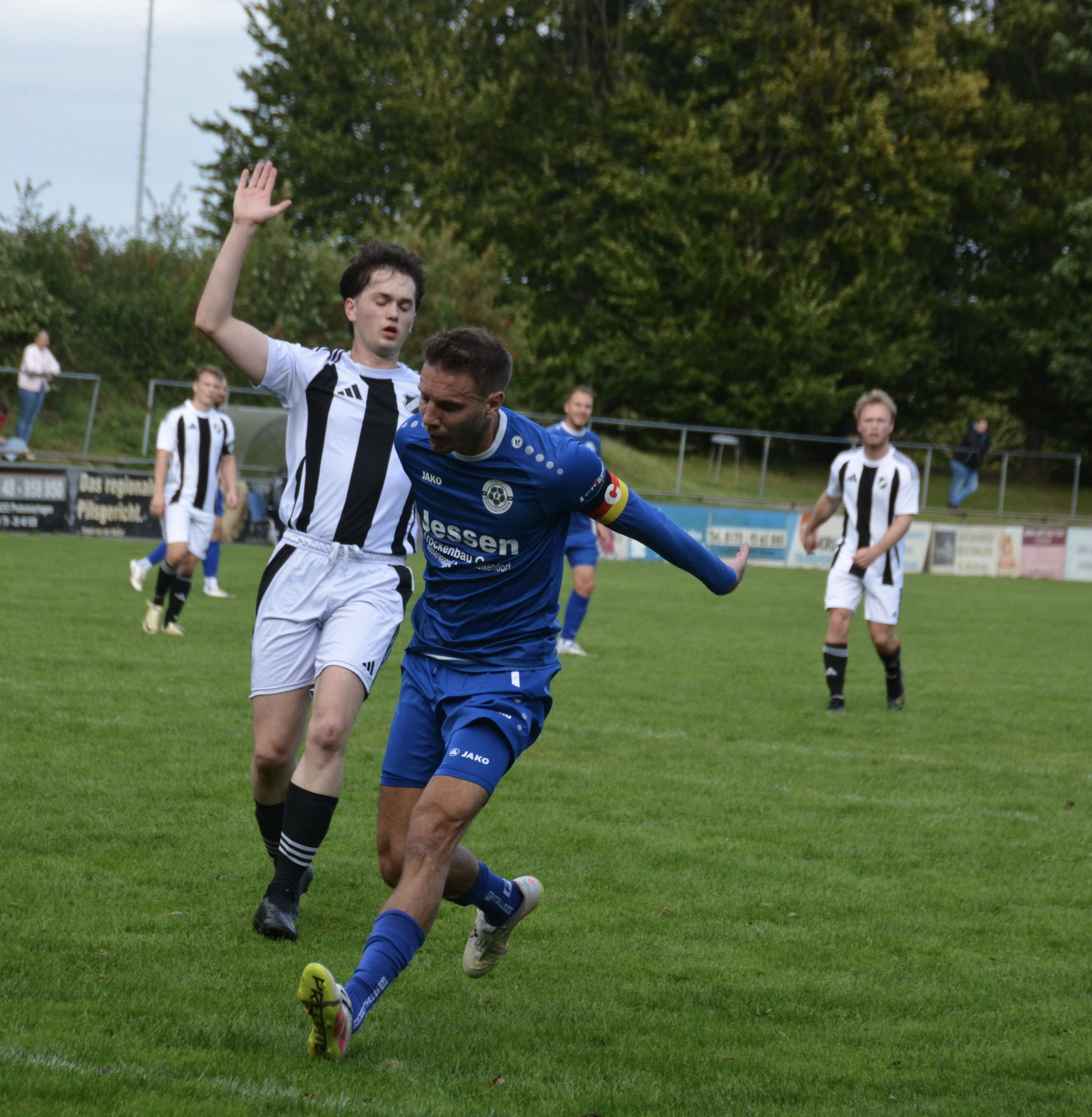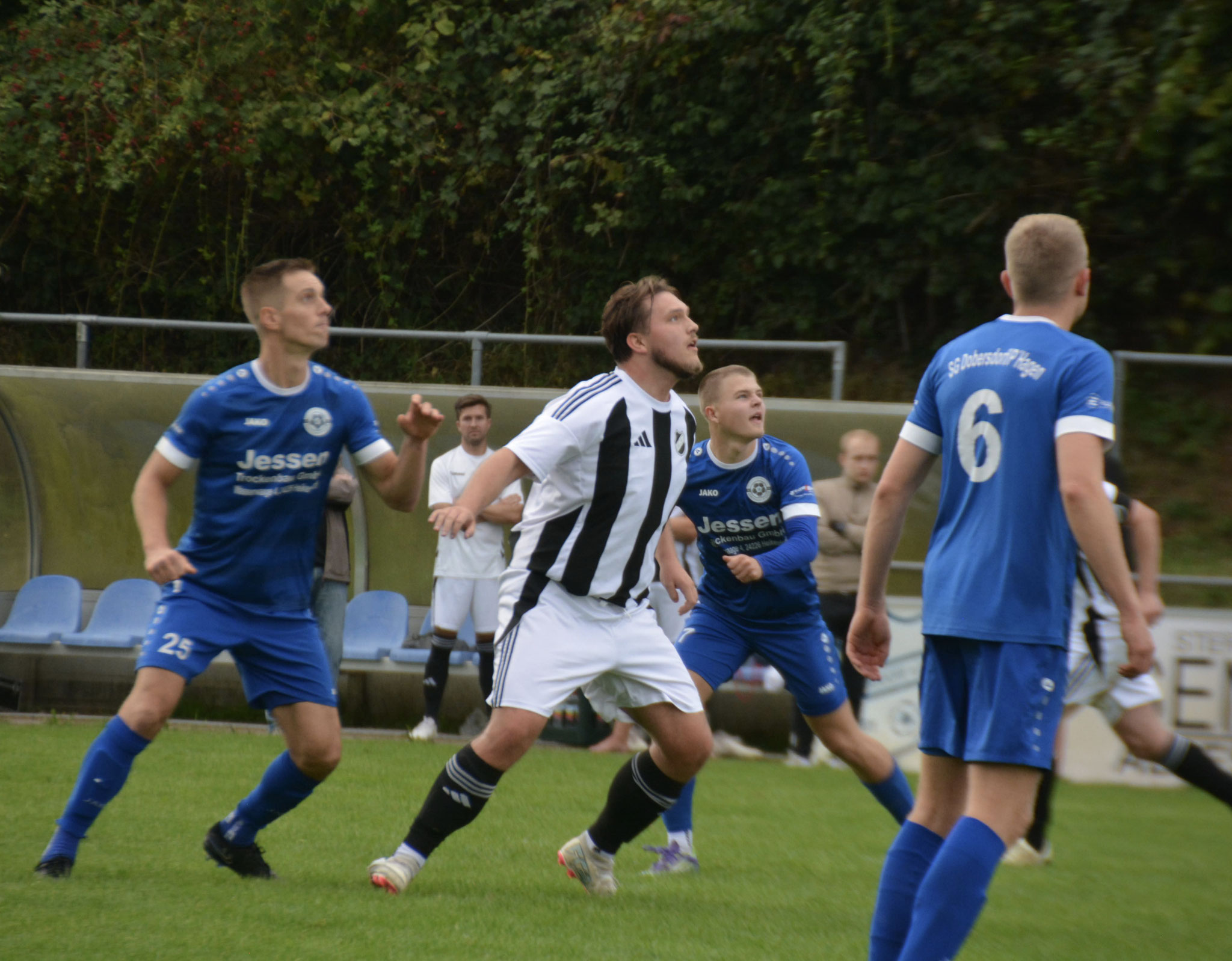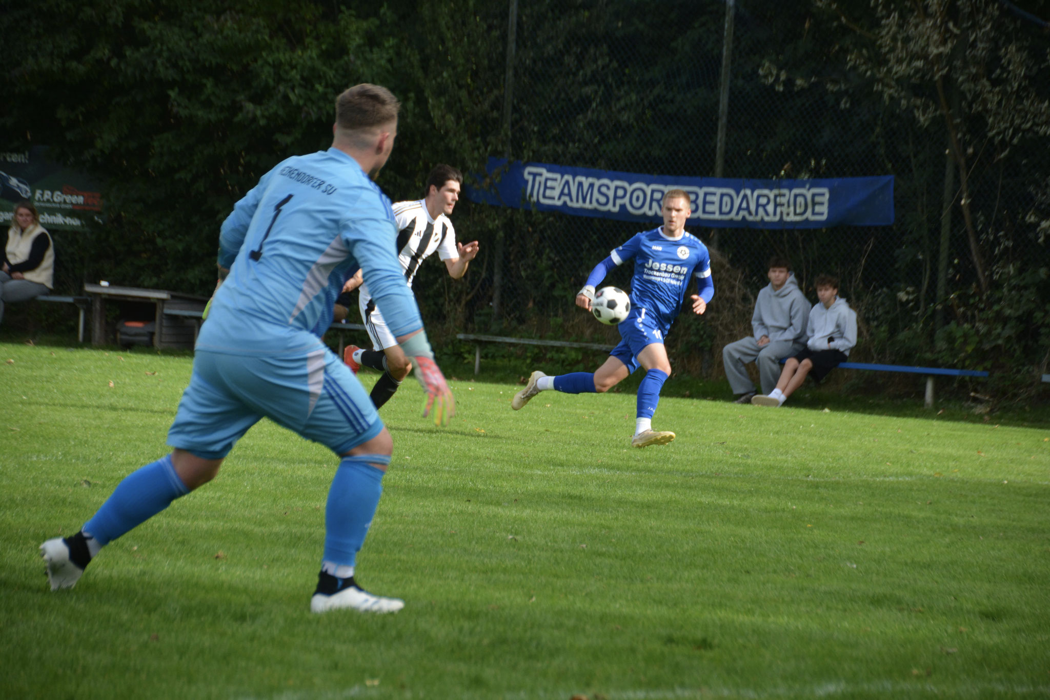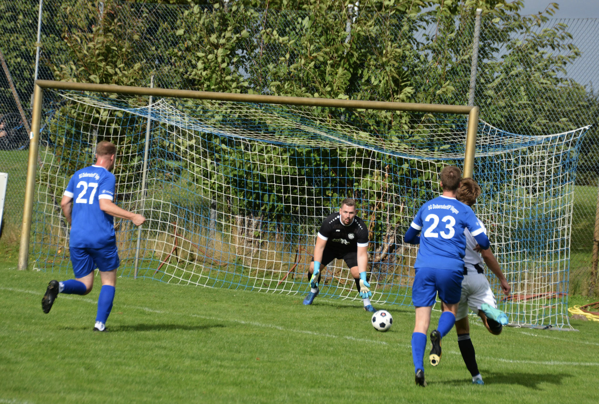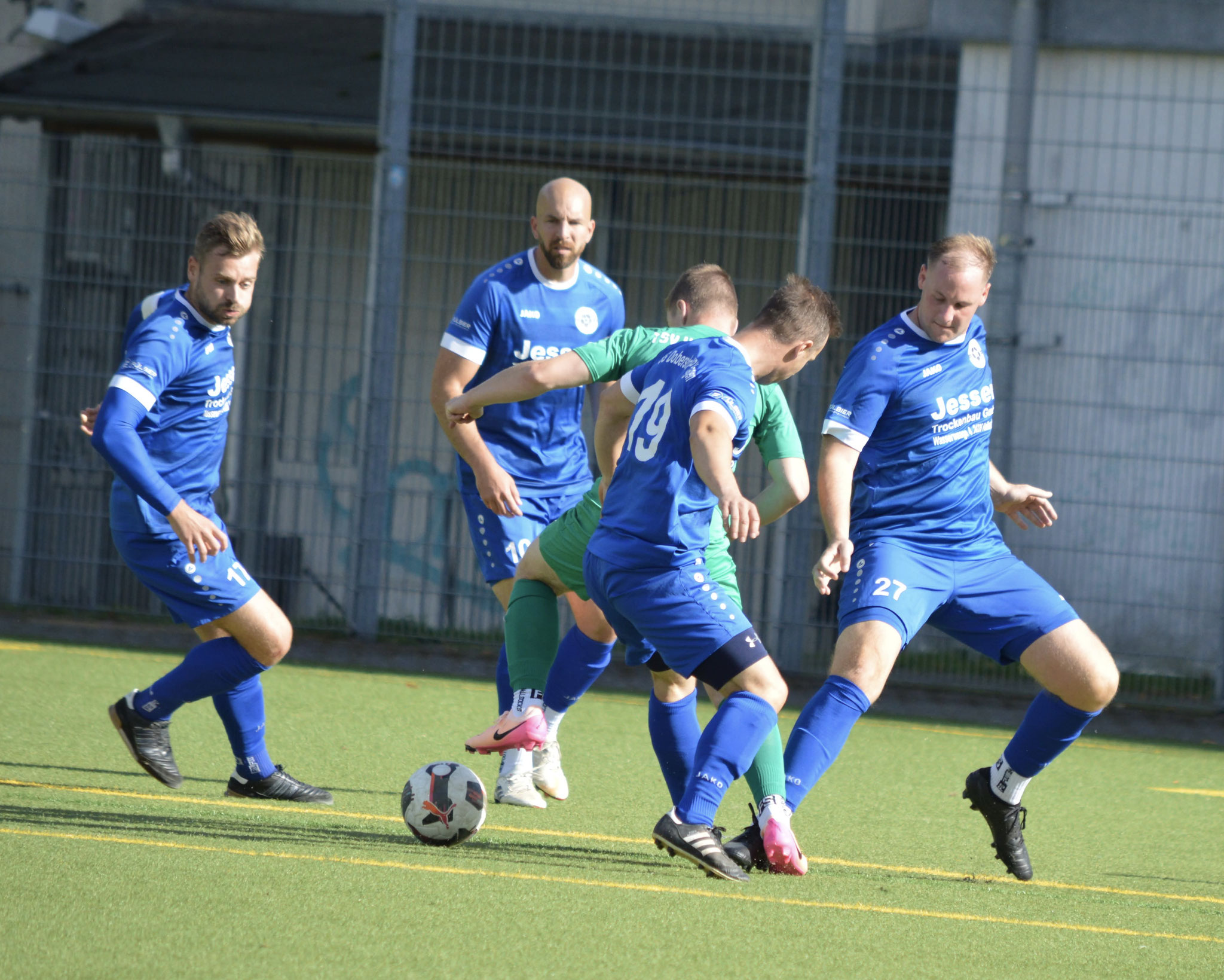Die Gäste, die ausschließlich durch lange Bälle agierten, hatten in der ersten Halbzeit das ein oder andere Mal den Ausgleich auf dem Fuß.